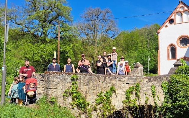 Die zweite Gruppe wanderte durch den Schlosspark zur Heins Mühle, am Bachentlang zur Abtei und über den Spielplatz am Schmetterlingsgarten zurück zur gemeinsamen Einkehr. Spannend für die kleinen Mitwanderer waren das laufende Mühlrad und sie mehrmalige Überquerung des Brexbach.